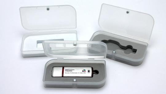 Klassische Magnetboxen aus Kunststoff für USB-Sticks werden mit einer Schaumstoffeinlage passend zum Produkt ausgestattet. Auf Nachfrage kann der Deckel bedruckt werden, zum Beispiel mit Ihrem Logo.